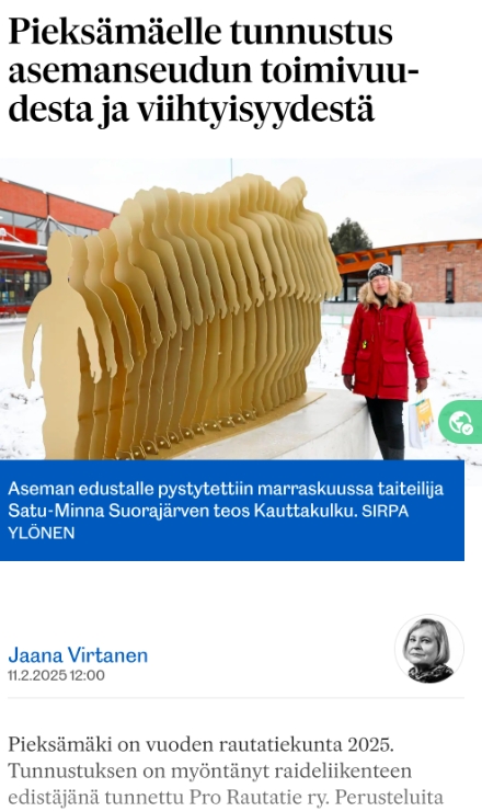 Länsi-Savo, Sirpa Ylönen, 24.11.2024: Pieksämäen asema-​aukion uusi veistos sai kiitosta