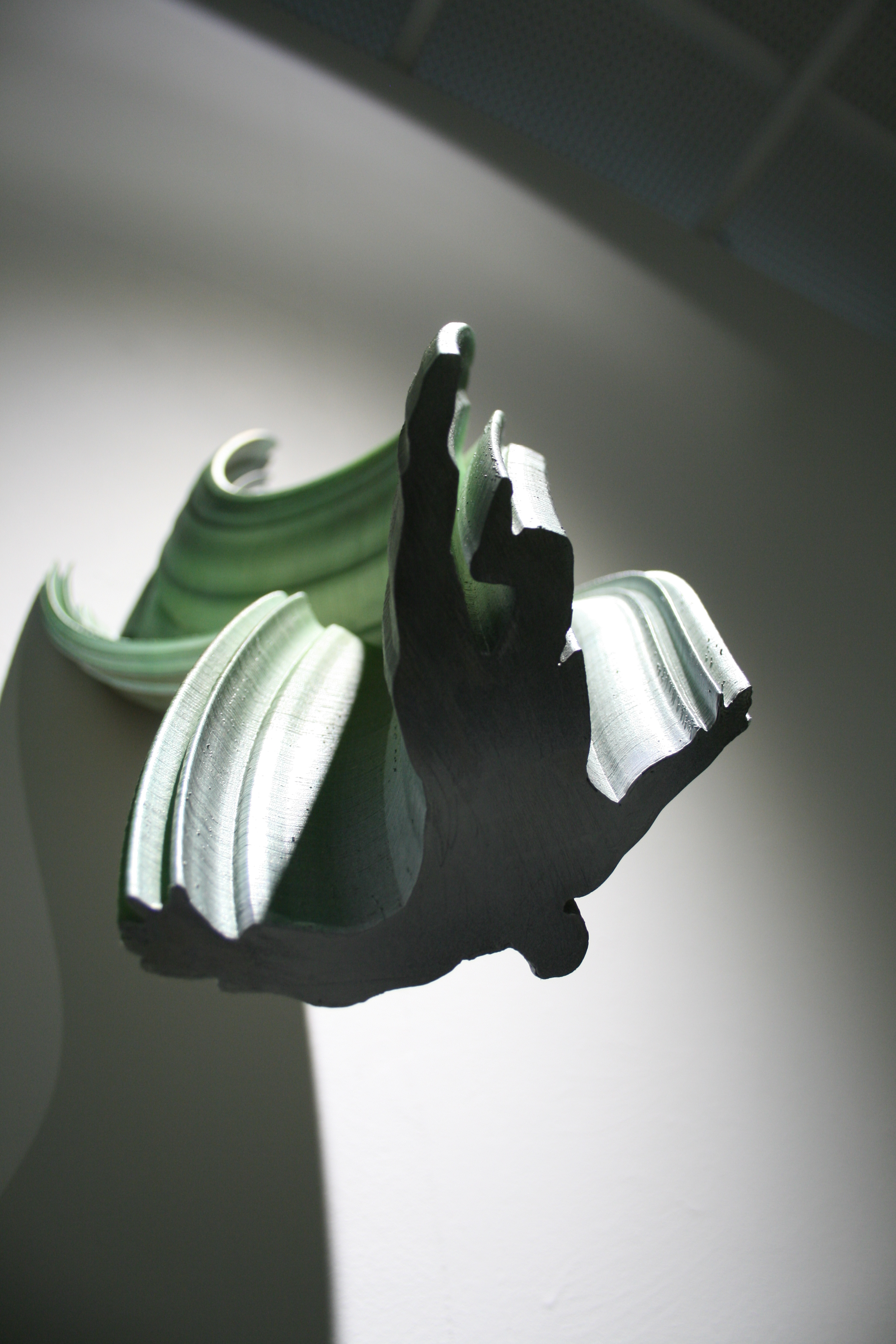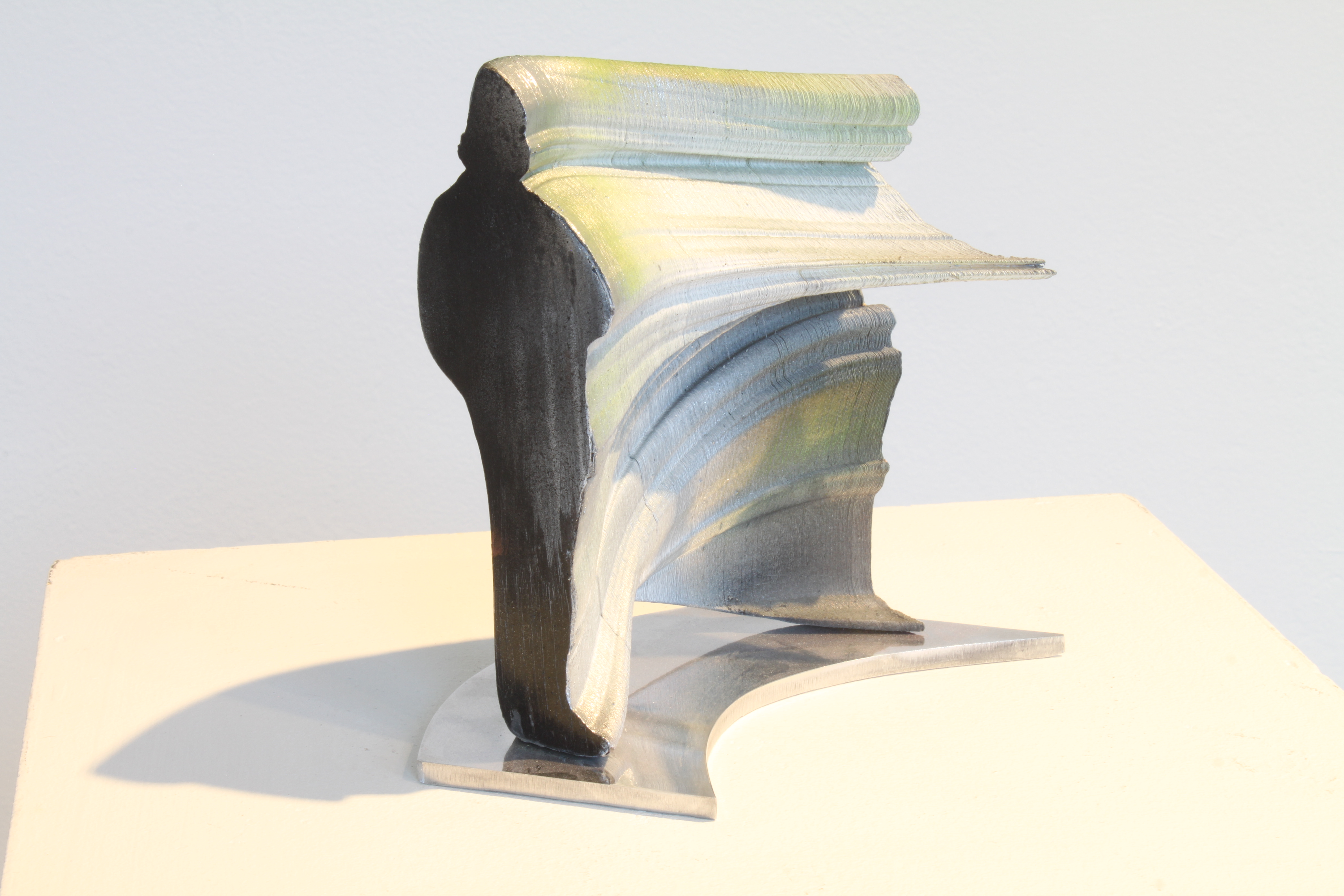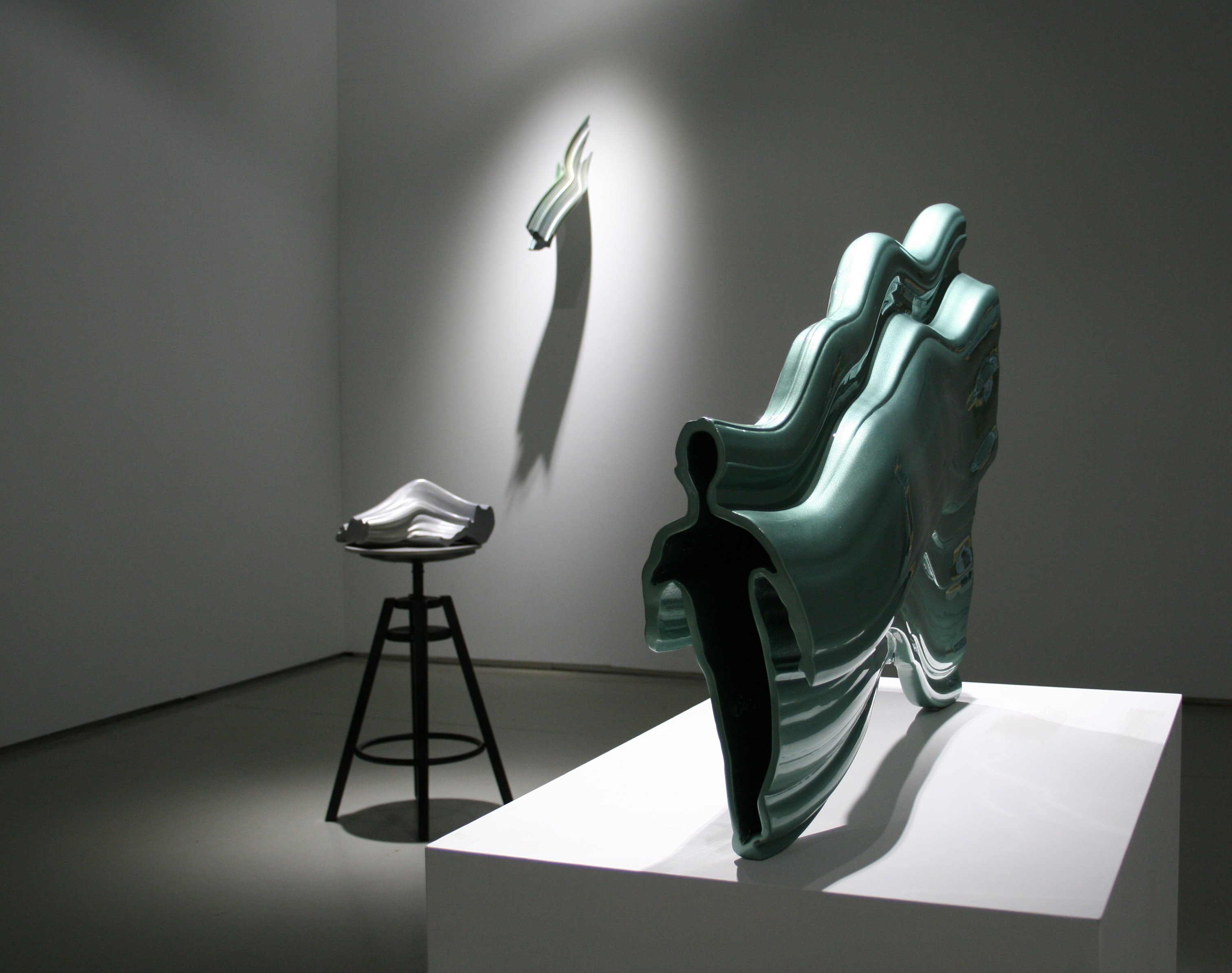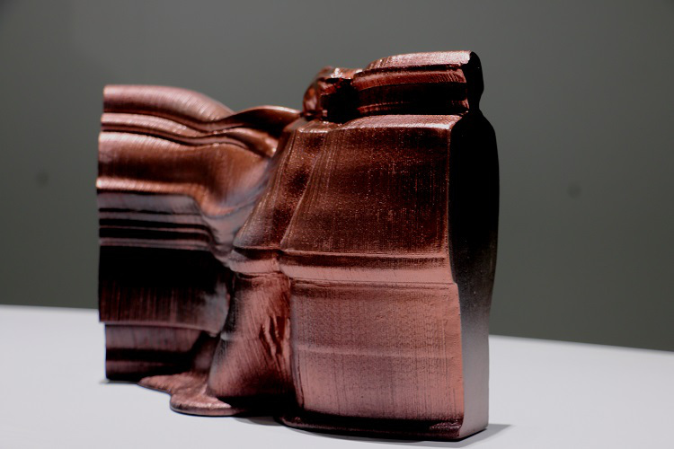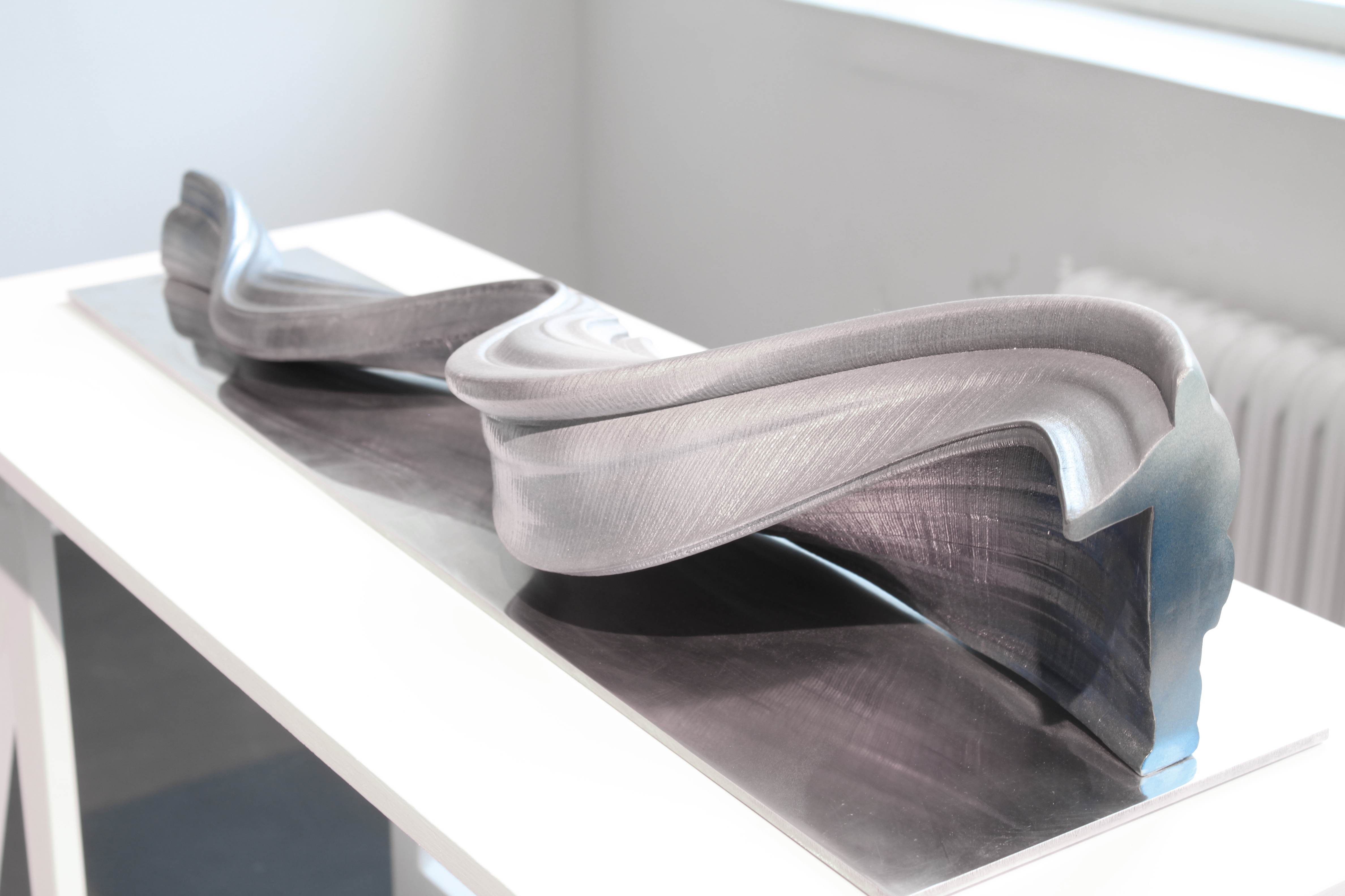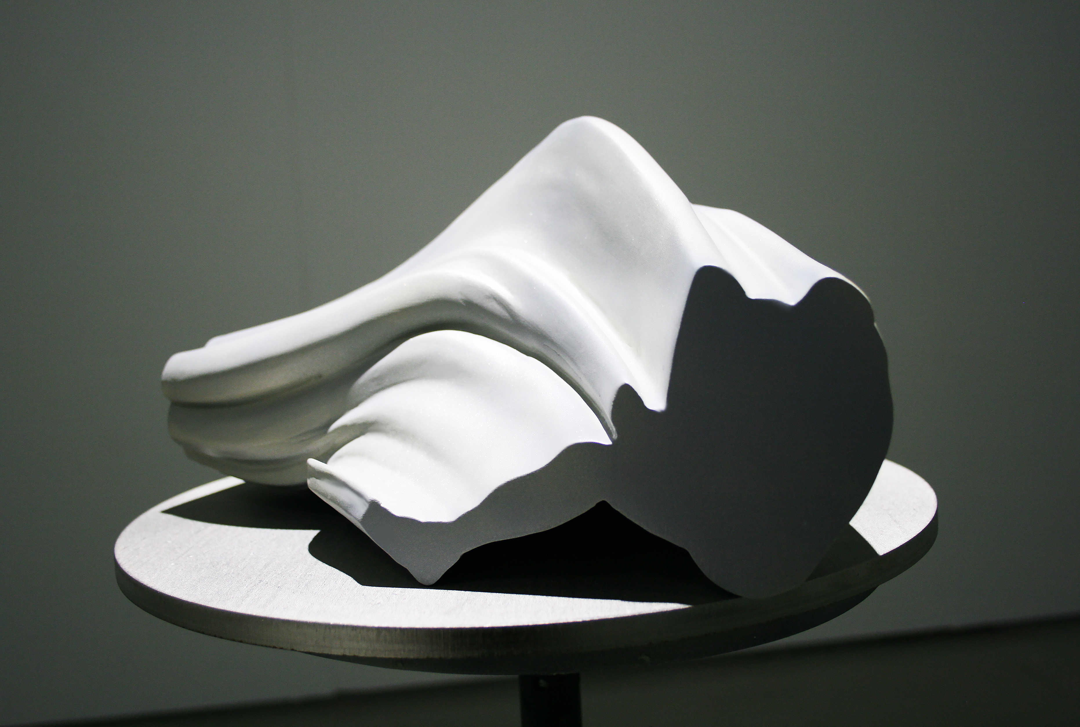 Into the shapes of 3d printed sculptures have been recorded human movements. SSilhouette lines change into each other (e.g. from a child to an adult), and at the same time the outlines of the sculpture are drawn. The sculptures are fragments or condensations of time. As the silhouette lines build forms, various breaks, twists, collisions occur, and I call the resulting forms manifestations of an interrupted continuum.